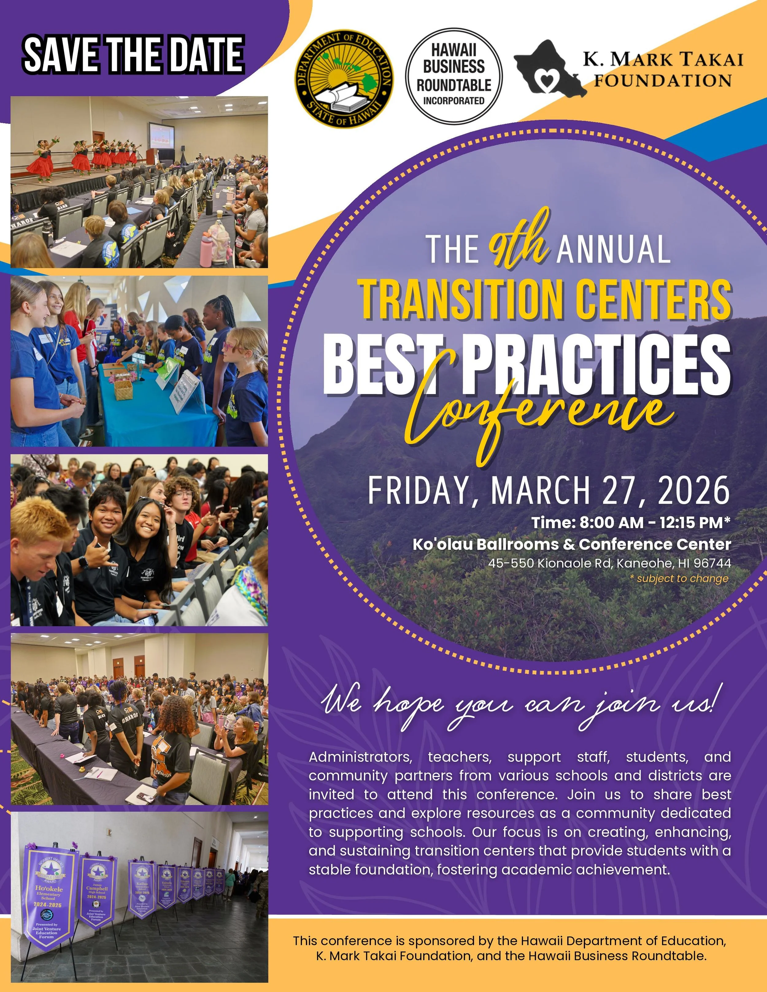 We are pleased to announce the 9th Annual Transition Centers Best Practices Conference, taking place on Friday, March 27, 2026, at the Ko‘olau Ballrooms & Conference Center.